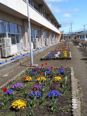 満開の桜と花壇のチューリップとビオラです。子供たちがくるのを待っていたかのように咲き誇っています。 今年度の子供たちのがんばりが、大いに期待できる始業式になりました。