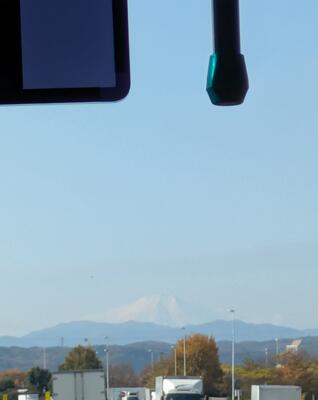 最初の休憩ポイントの羽生サービスエリアを予定よりはやく出発し、圏央道に入りました。うっすらと富士山が見えます。