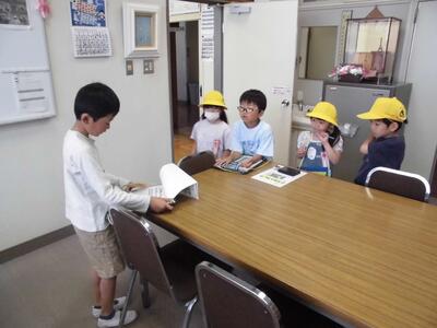 2年生が先日の取材をもとに、1年生に特別教室や職員室、校長室の案内をしました。