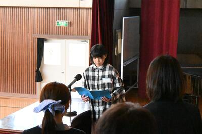 教科書授与 新入生を代表して、新しい教科書を受け取りました。「ありがとうございます。」のお礼の言葉も堂々と落ち着いて言うことができて、とても感心しました。